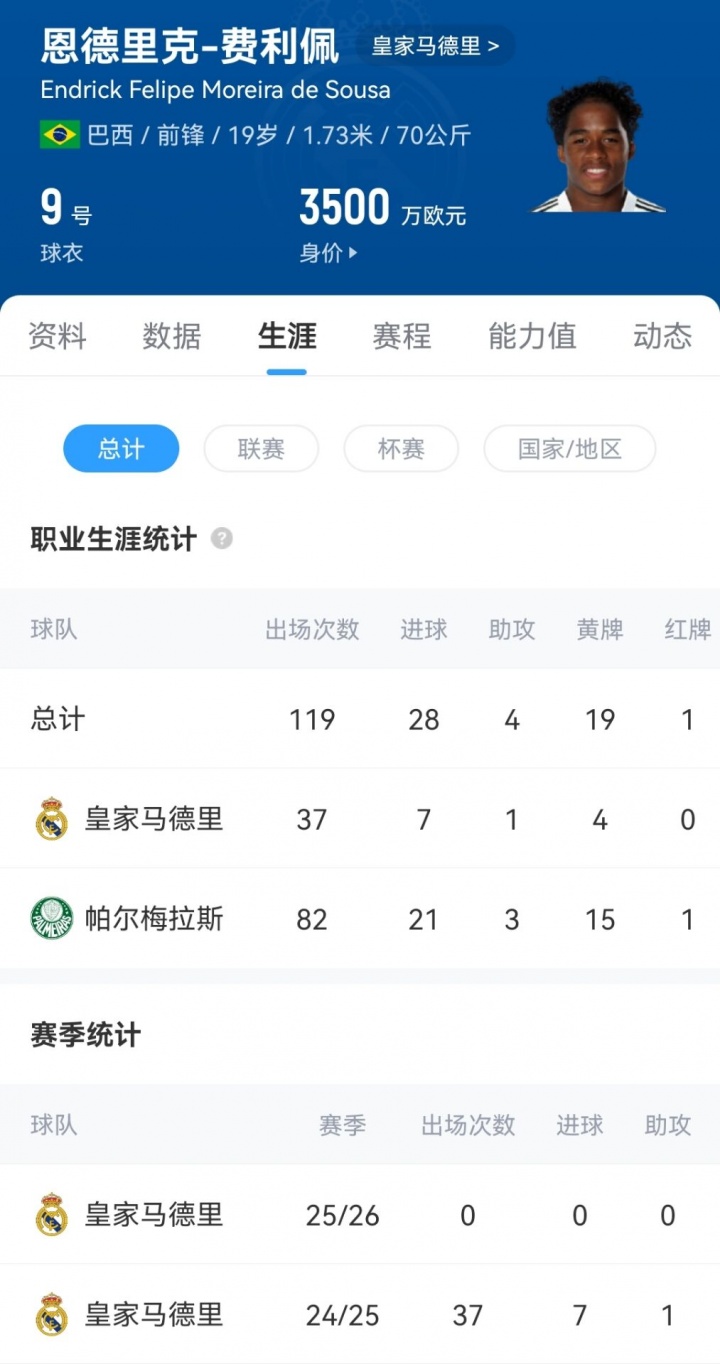 Real Madrid đã chi 47,5 triệu euro để giới thiệu Endrick vào mùa hè năm 2024. Mùa giải trước, Endrick ra sân 37 lần, tổng cộng 847 phút, đóng góp 7 bàn thắng và 1 đường kiến tạo. Giá chuyển nhượng của Endric giảm từ mức cao nhất 60 triệu euro xuống còn 35 triệu euro.